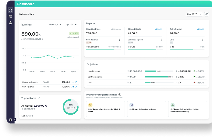 Mejora el rendimiento de tu equipo de ventas con una herramienta de gestión de incentivos impulsada por IA, dashboards en tiempo real y planes de compensación personalizados. Impulsa la motivación, supera los objetivos y retén eficazmente al mejor talento.