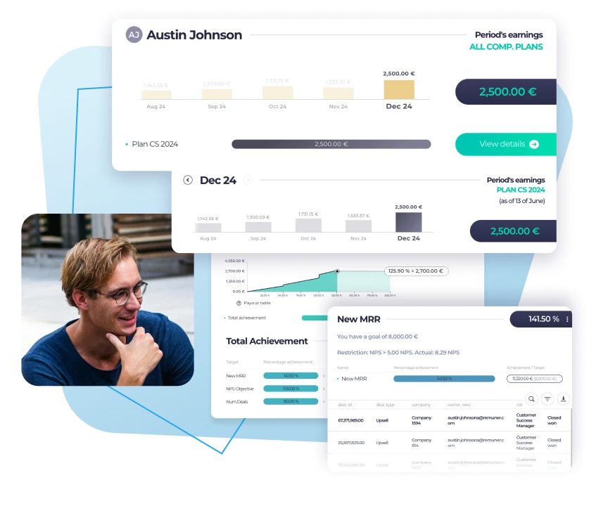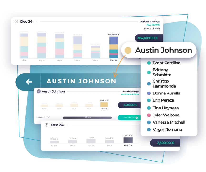 Every team member has instant access to their achievement and accrued commissions, which helps them take actions faster and push performance while the period is active, instead of waiting until end of period to be informed about their results.